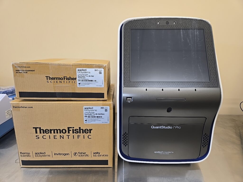 The Applied Biosystems QuantStudio 7 Pro is a ‘high-throughput’ Real-time quantitative qPCR System which combines flexibility, ‘ease of use,’ and security in one low ‘footprint’ system. The system features a 12-inch color touchscreen interface and voice command control, and facial authentication. Interchangeable blocks (96-well, 0.2 ml; 96-well 0.1 ml; and 384-well, and TaqMan Array card compatibility) allow for flexibility in assays. The QuantStudio 7 Pro also provides 6-dye multiplex detection with 21 filter/dye combinations. Features including RFID reading, networking, cloud access, and compatibility to robotic systems allow for “high-throughput” functionality for any laboratory.