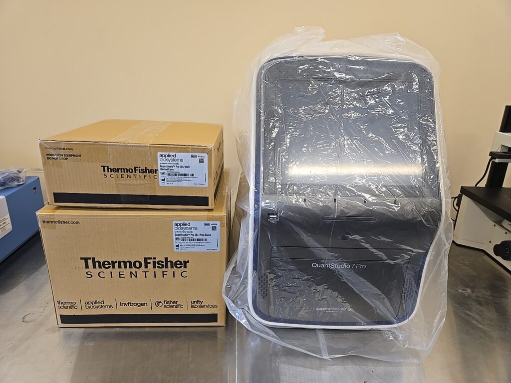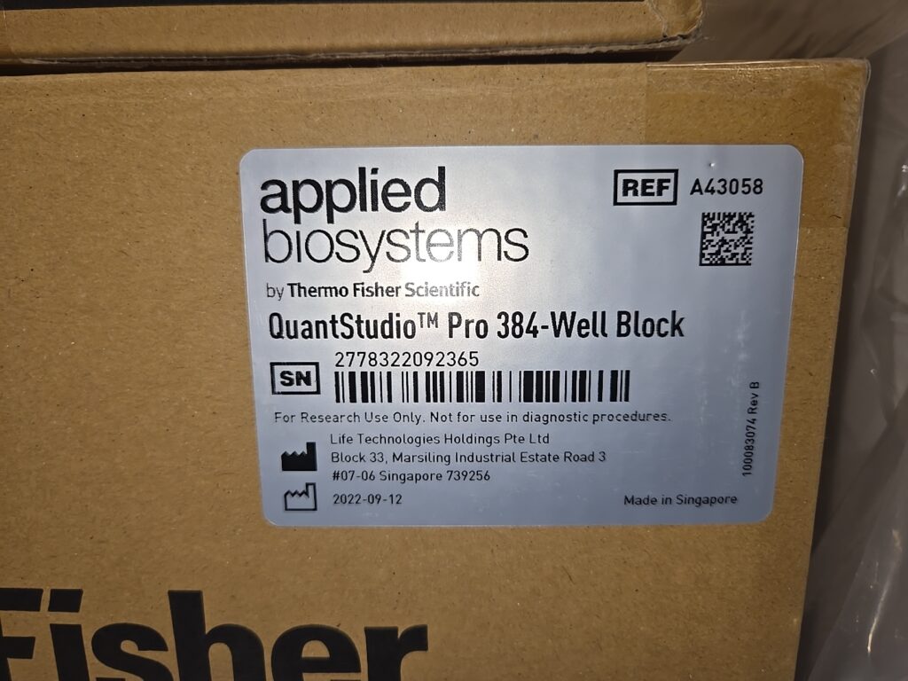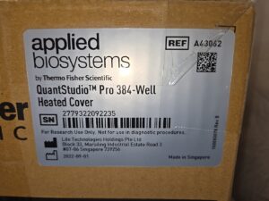 The unit “on sale” is ‘New’ and other than being ‘unpacked’ and ‘powered on’ without blocks installed, the unit is ‘Unused’. The sale includes ‘New-in-box,’ never-opened, 384-well Block and Heated Cover. Unit itself will not ship in original, but instead a compatible box. Sale comes with our 90-day warranty (Manufacturer’s Warranty Does Not Apply.)